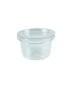Salsero con bisagra de Zeus Packaging en RPet transparente, disponible en 50 y 80 ml, paquetes de 100 unidades. Envase seguro, práctico y perfecto para salsas en take away y delivery.